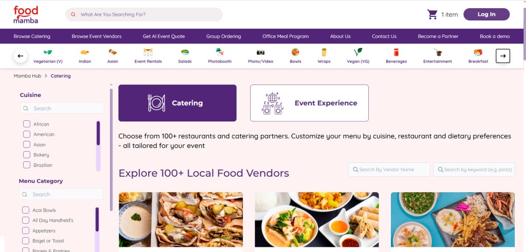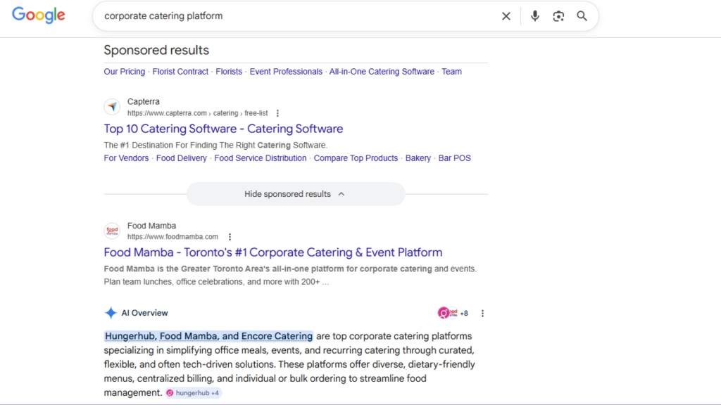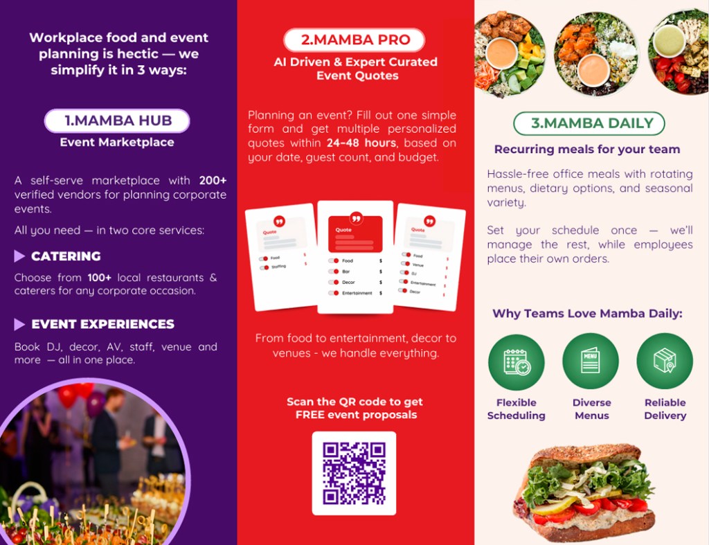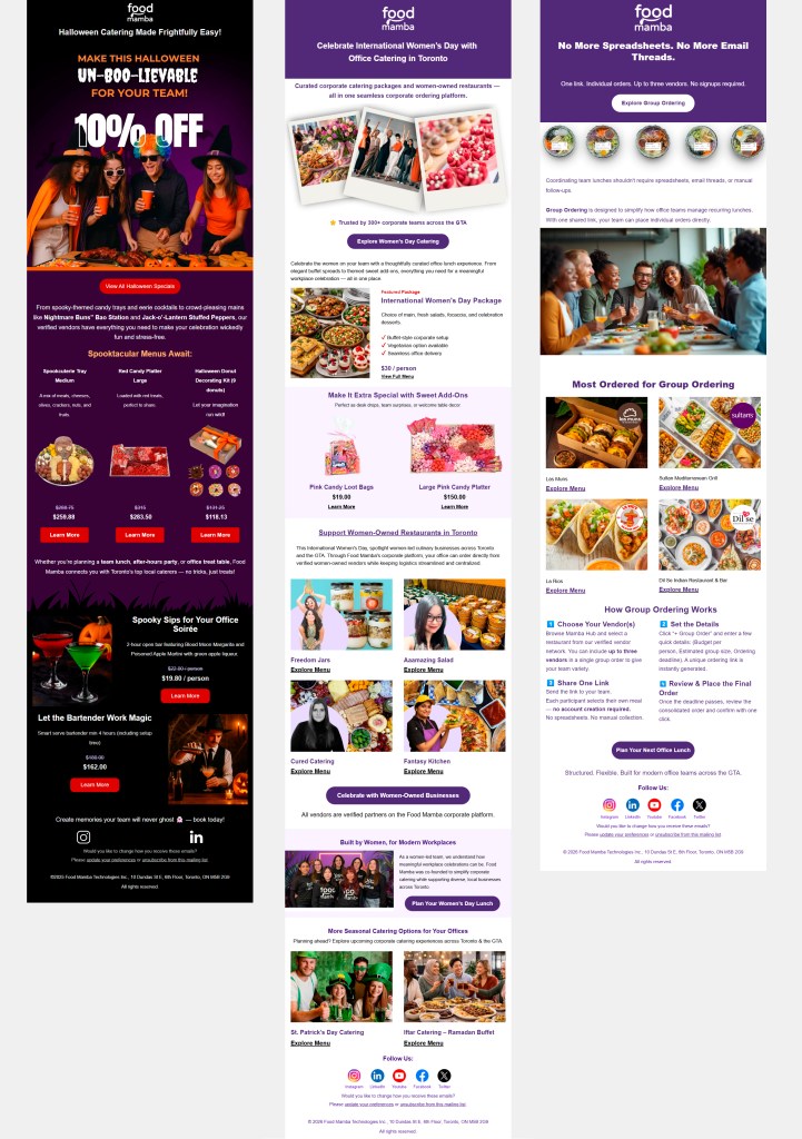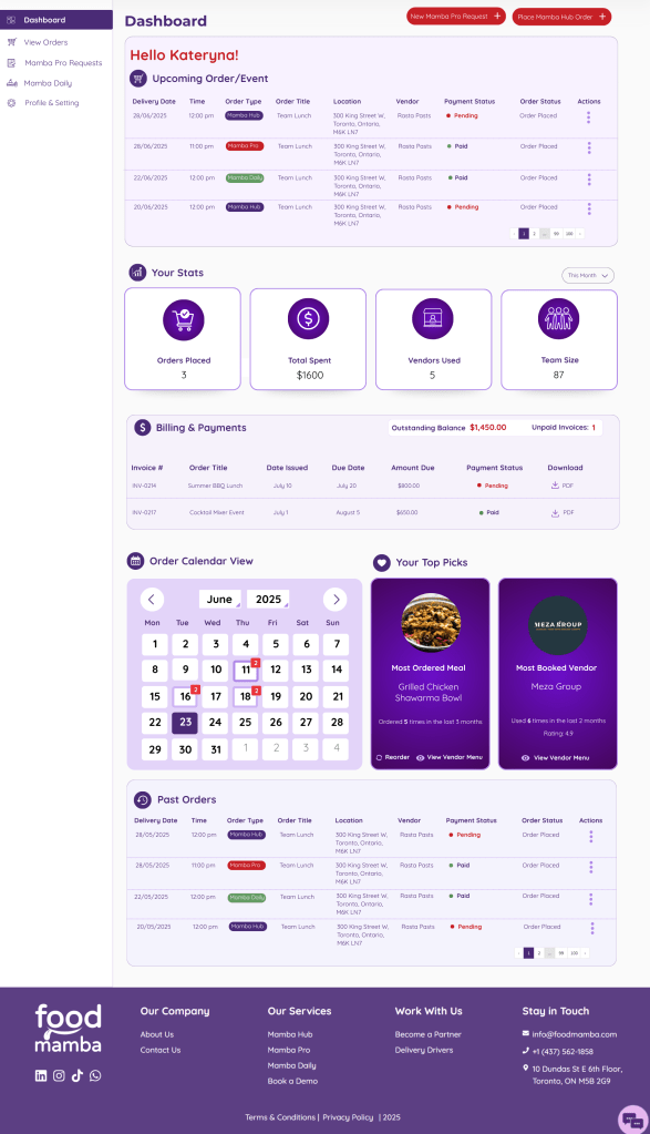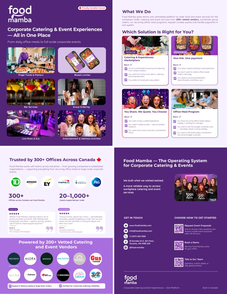 Food Mamba is a Toronto-based corporate catering and events marketplace that connects companies with 200+ verified vendors, including caterers, event staff, rentals, and entertainment providers. As Senior Marketing Specialist, I led initiatives across website redesign, marketplace structure, SEO, and B2B marketing to improve the platform experience and support business growth.